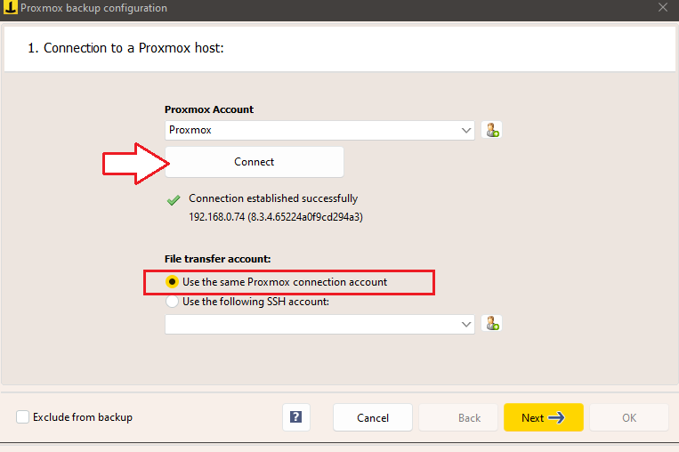 Effettua la connessione a Proxmox con l’account appena creato, in modo da procedere alle successive configurazioni del backup (nella stessa finestra è possibile scegliere anche un account diverso (SSH) per il trasferimento file).