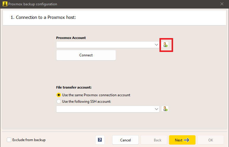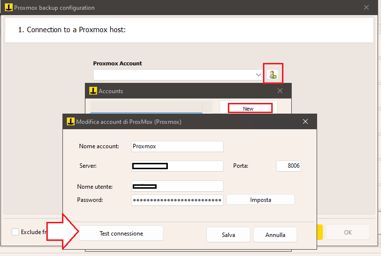 Come primo passaggio è necessario inserire l’account di Proxmox, quindi definire l’indirizzo del server, la porta e le credenziali dell’utente amministratore: