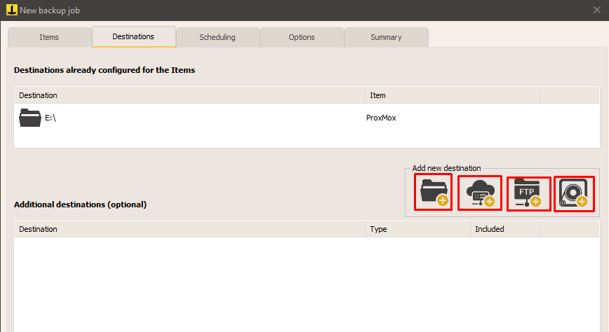 Se vuoi fare una ulteriore copia del backup delle macchine virtuali Proxmox anche in altre destinazioni, come ad esempio un server FTP o uno spazio cloud Amazon S3, nella scheda successiva puoi aggiungere una o più destinazioni: