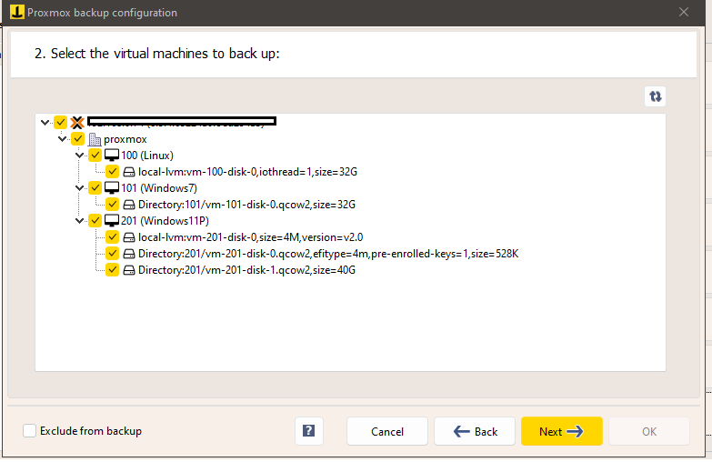 Seleziona le VM e i singoli dischi di cui vuoi fare il backup:
