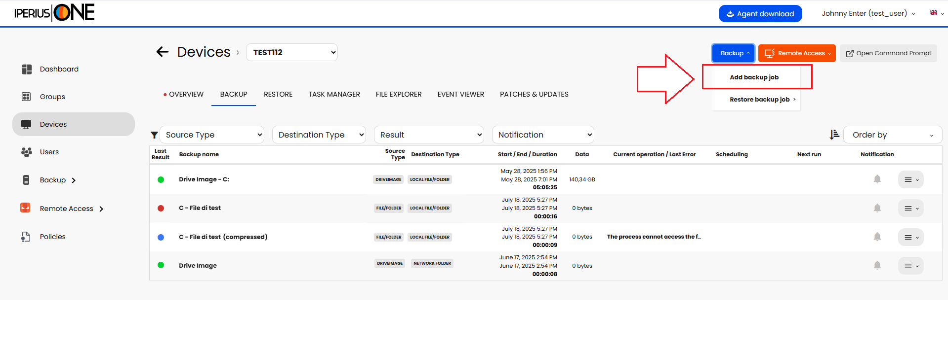 Adesso il job è nella lista dei backup del Dispositivo, ed è possibile compiere svariate operazioni come andare in edit del job, duplicarlo, eliminarlo e soprattutto eseguirlo.
