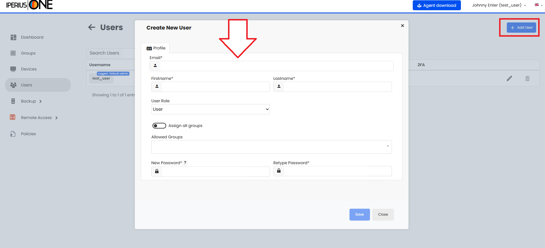 Ogni nuovo utente creato dalla piattaforma di Iperius One avrà ruolo Admin.