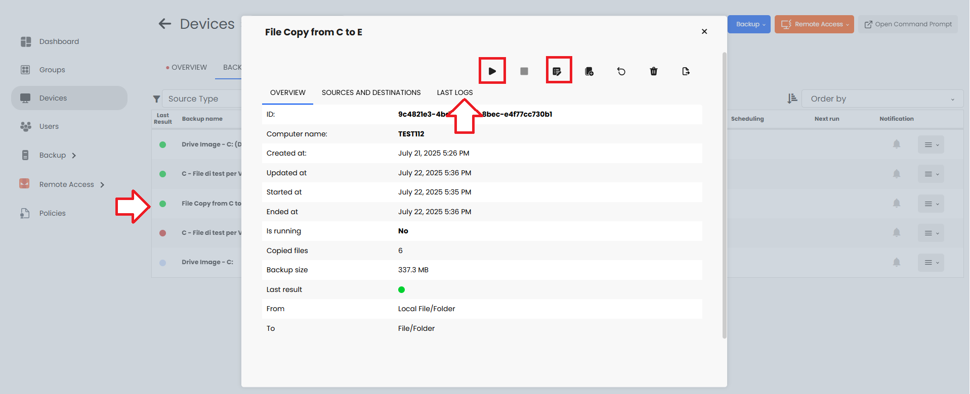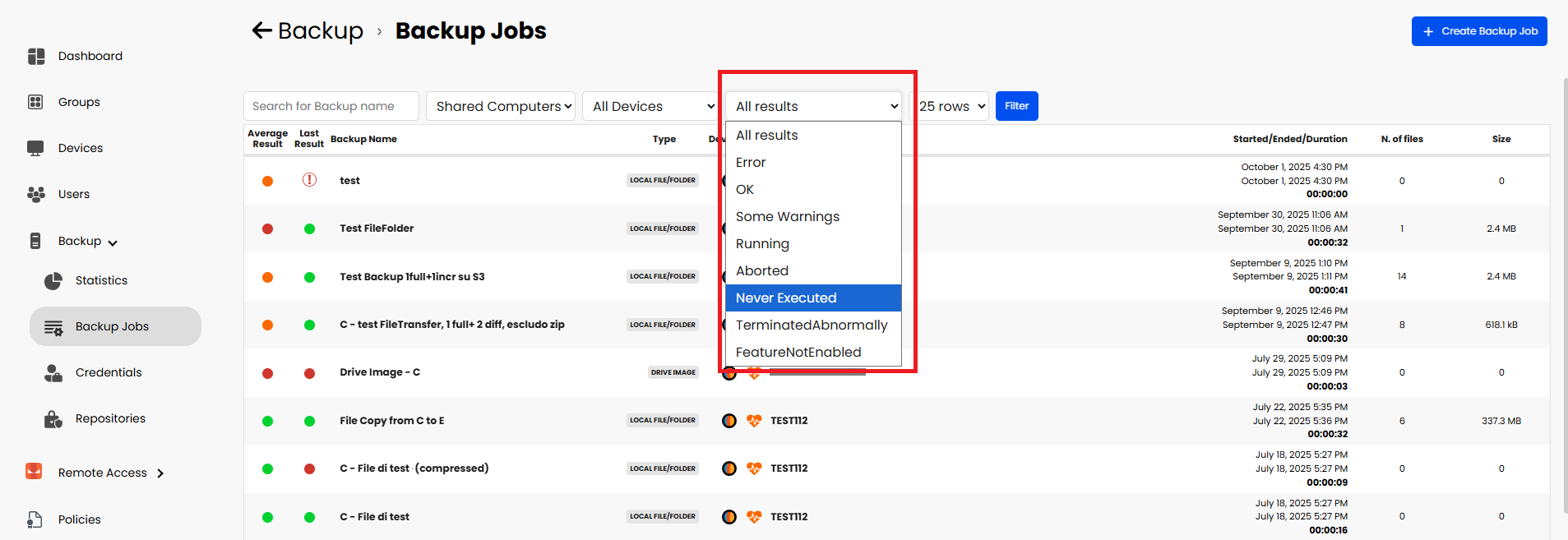 In “Operazioni di backup” sono listate tutte le operazioni di backup, che si possono filtrare per gruppi, dispositivi, o risultato dei backup: