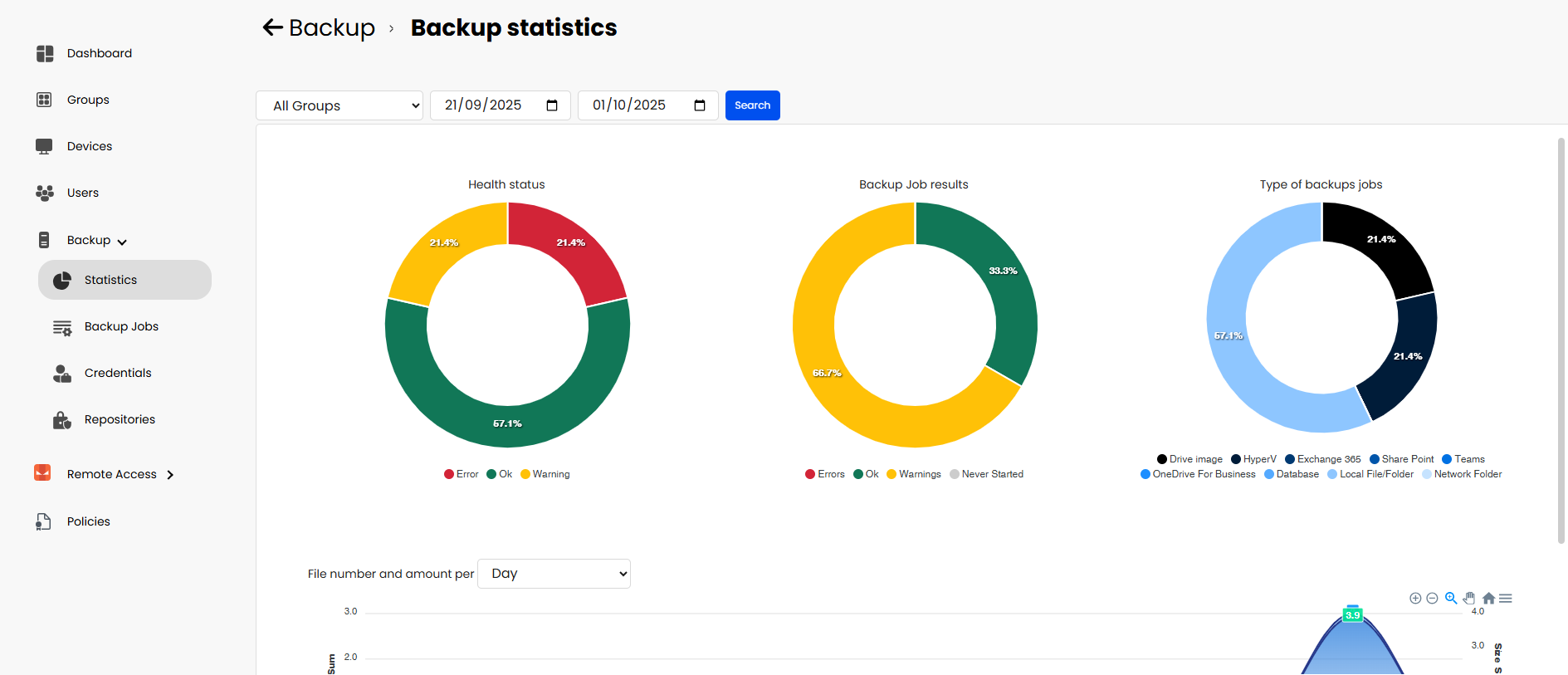 In “Statistiche” possiamo vedere subito l’andamento dei backup con dei grafici chiari che forniscono diverse informazioni come la salute dei dispositivi, lo stato dei job, la tipologia di Job eseguiti e il numero di dati e quantità copiati: