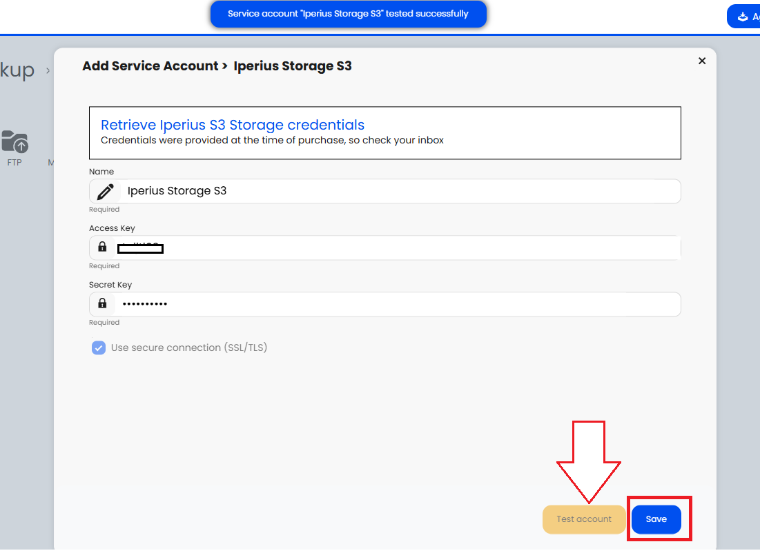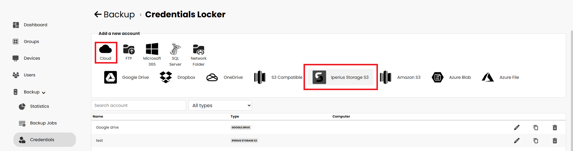 Creiamo e salviamo per esempio un account Cloud, di tipo “Iperius Storage s3”: