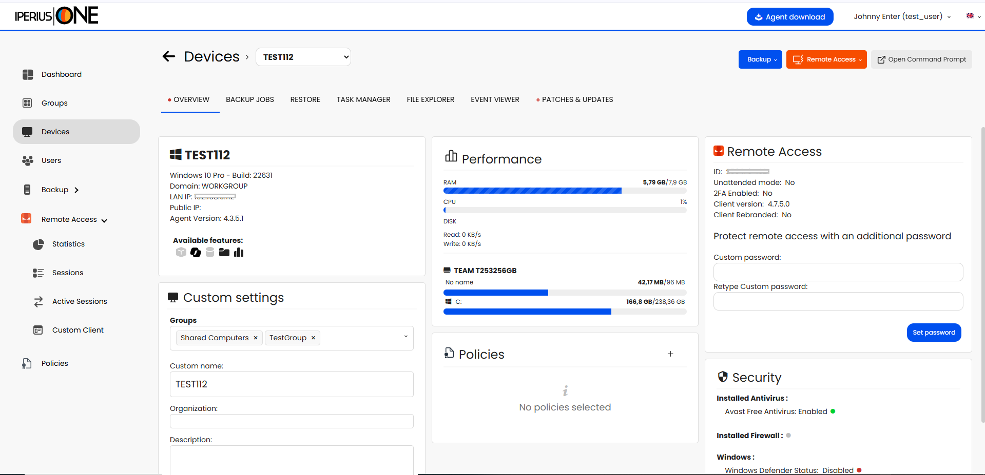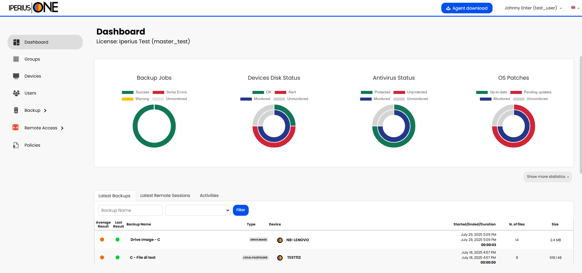 Pensato per MSP e professionisti IT, Iperius One permette infatti di creare, editare e monitorare i backup, accedere ai dispositivi da remoto, controllare patch di sistema, stato dei dischi, antivirus, creare policy specifiche da applicare a determinati computer o gruppi di computer, e molto altro — tutto da una sola piattaforma.