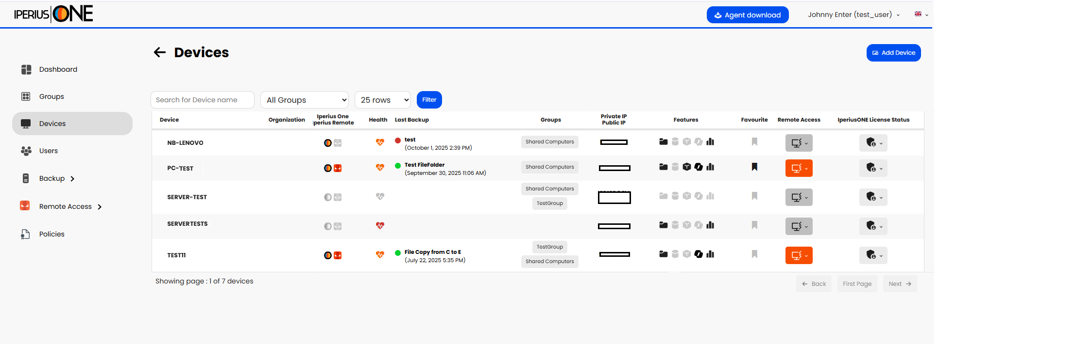 Questa panoramica ti consente di avere sotto controllo l’intero parco dispositivi: backup, accessibilità remota, stato operativo e configurazione — tutto in un’unica schermata.