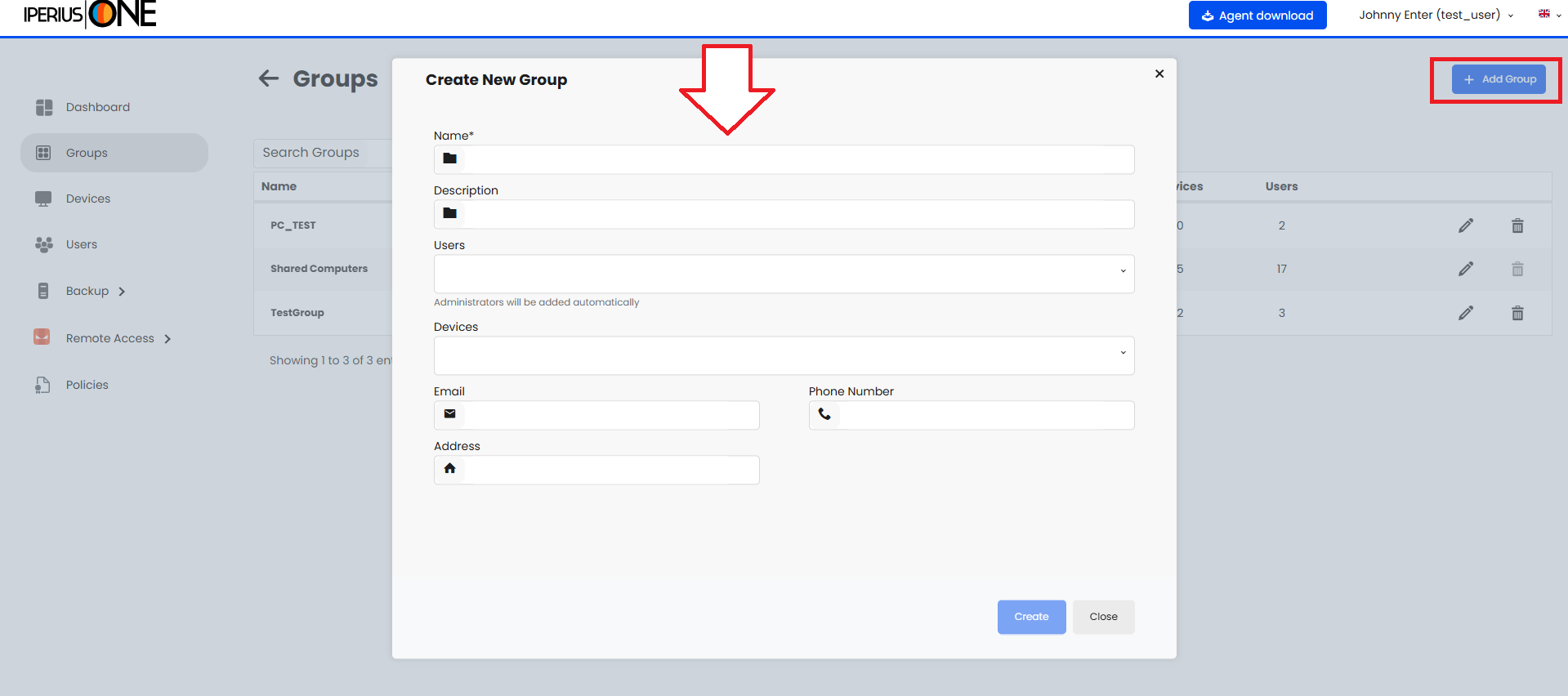 - Gruppi: Organizza e gestisci i dispositivi in gruppi logici (es. per sede o cliente), assegnandogli poi anche a ciascun utente di tipo User per andare a costruire quella che poi sarà anche la rubrica di Iperius Remote.