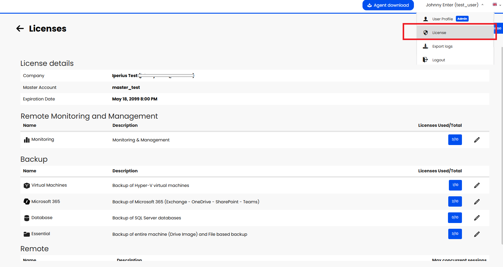 - Funzionalità: tramite una serie di icone, mostra i moduli attivi sul dispositivo (backup immagine, backup 365, monitoring,backup Hyper-V e backup SQL)