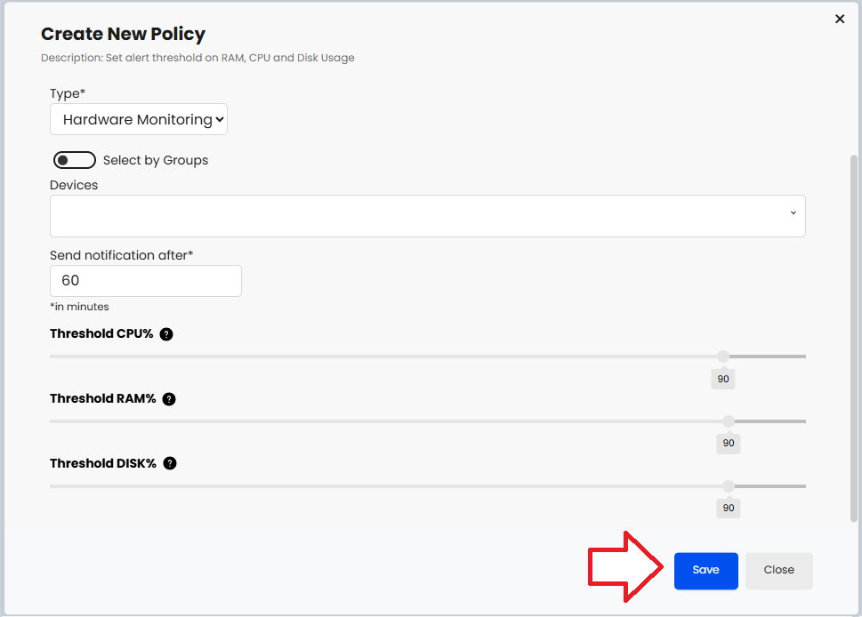 - Hardware Monitoring: questa policy permette di notificare all’utente se ram, CPU e disco superano una certa soglia