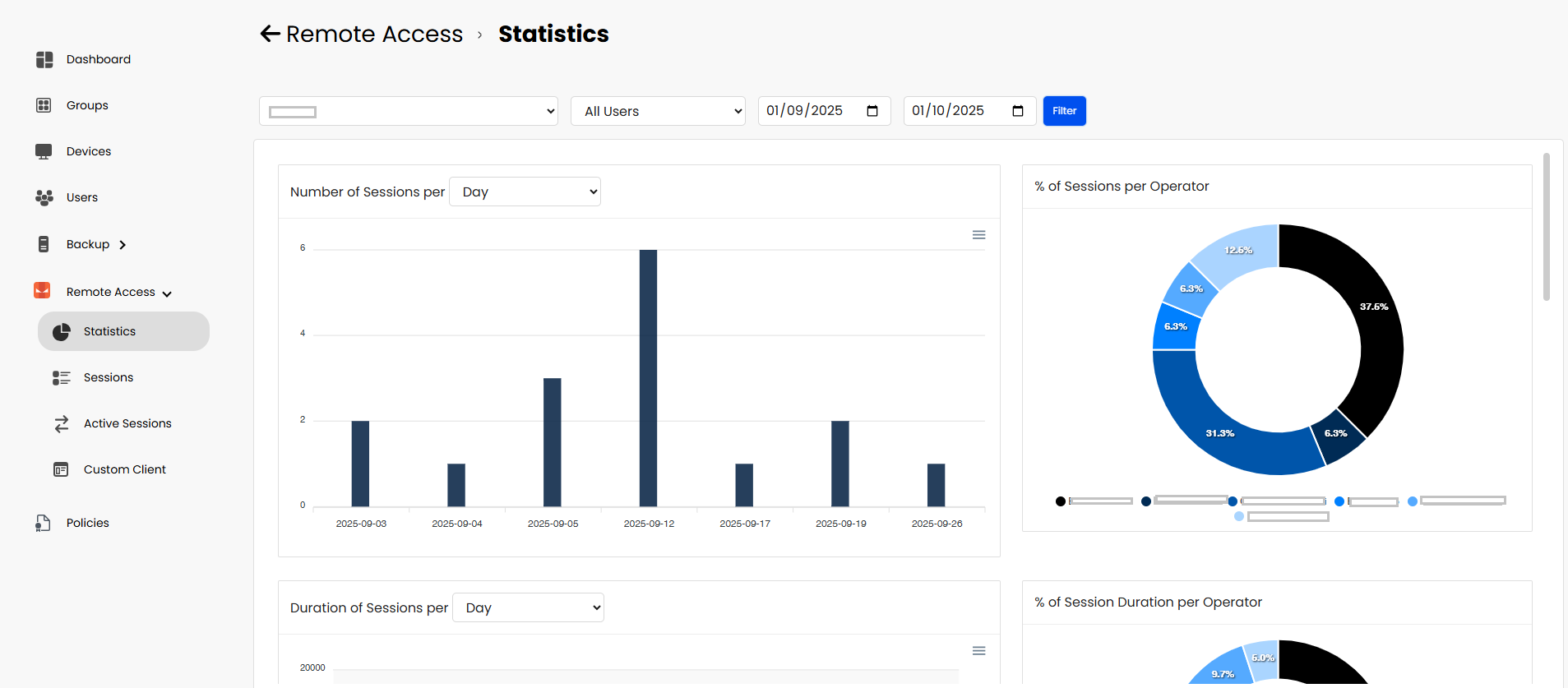 In “Statistiche” vengono visualizzati una serie di grafici che descrivono le statistiche delle connessioni, come per esempio il numero di sessioni eseguite in specifici giorni , la percentuale di sessioni gestite da ciascun operatore, la durata totale delle sessioni per ogni giorno, etc..