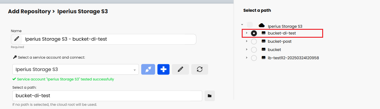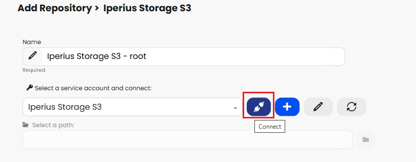 Nel menù a tendina troviamo già le credenziali S3 appena create, clicchiamo su “Connetti” in modo da testare la connessione e specificare poi la cartella da usare come repository: