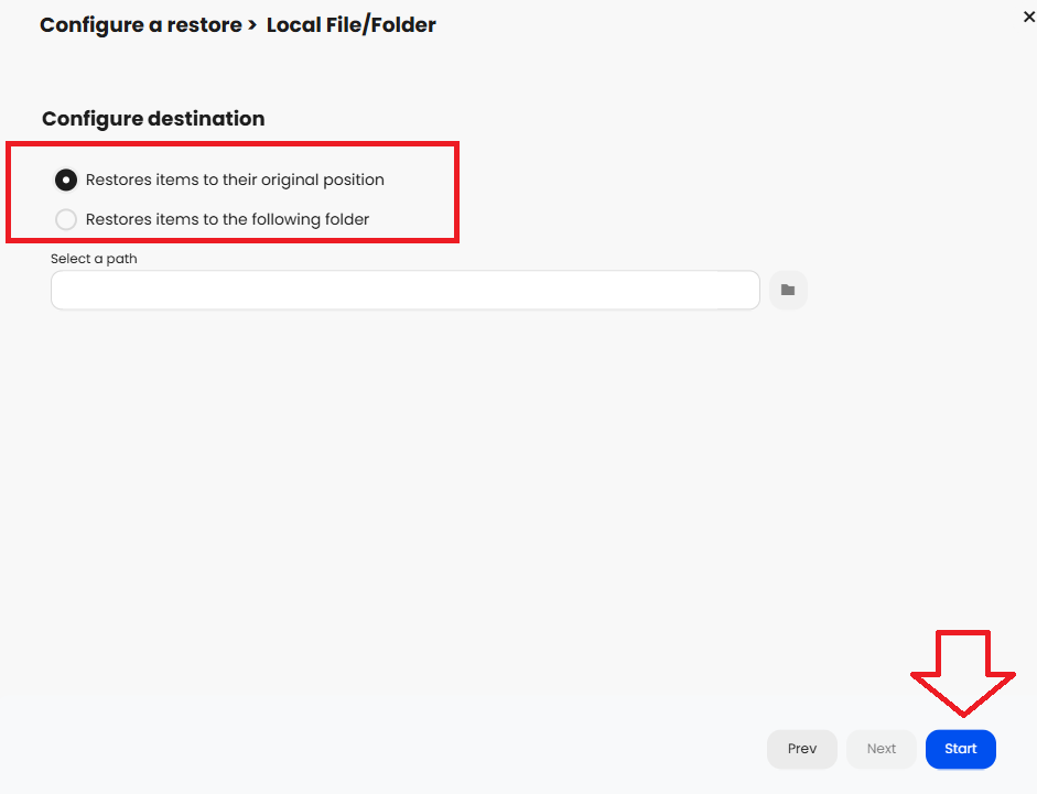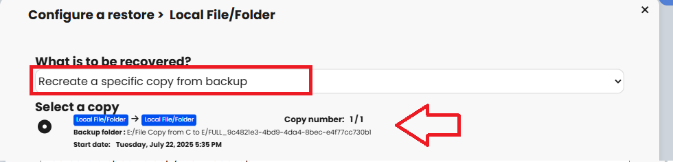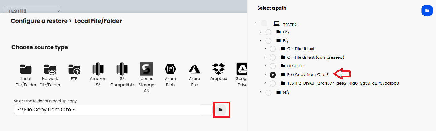 Per esempio per ripristinare un backup su un percorso locale scegliamo “Local File/folders” e selezioniamo il percorso dove è salvato il backup da ripristinare (nel nostro caso per esempio si tratta di un percorso locale) e clicchiamo su “Avanti”: