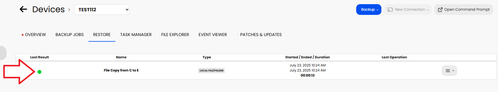 Adesso l’operazione di restore è nella lista dei Restore del device, con il risultato dell’esecuzione: