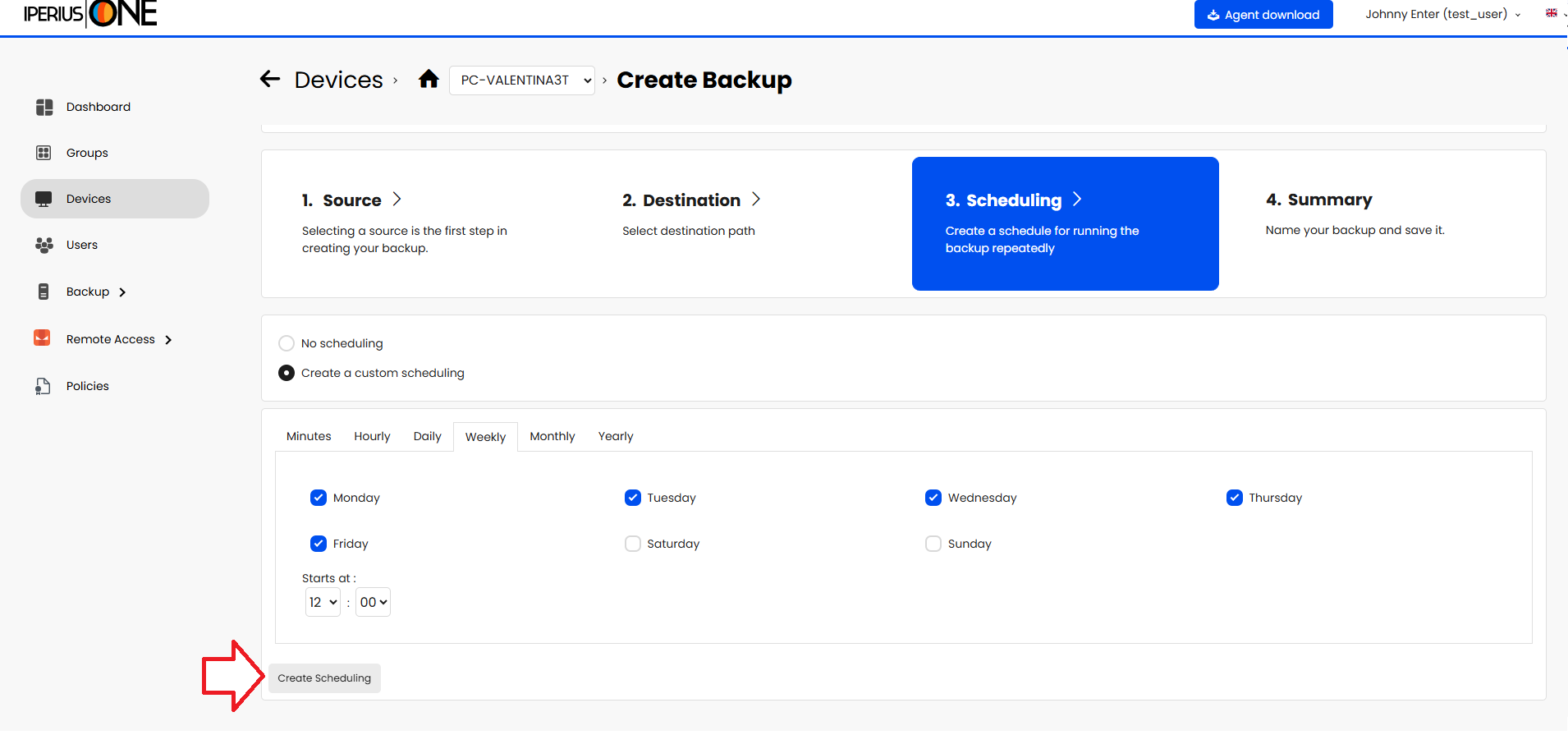Una volta configurata la destinazione, è possibile Pianificare le operazioni di backup, per esempio settimanalmente: