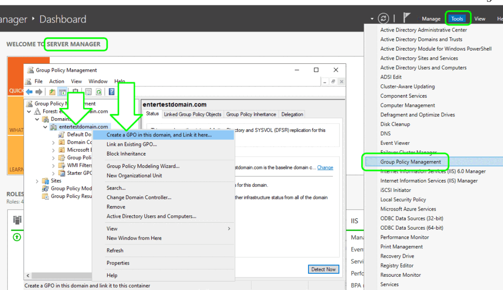 Nel Server Manager, andiamo su “Strumenti” e quindi clicchiamo sulla voce di menu “Gestione criteri di gruppo” (Group Policy Management). Nella finestra di gestione, clicchiamo con il pulsante destro sul nome del dominio e quindi sulla voce di menu per creare un criterio di gruppo nel dominio, come mostrato nell’immagine sottostante: