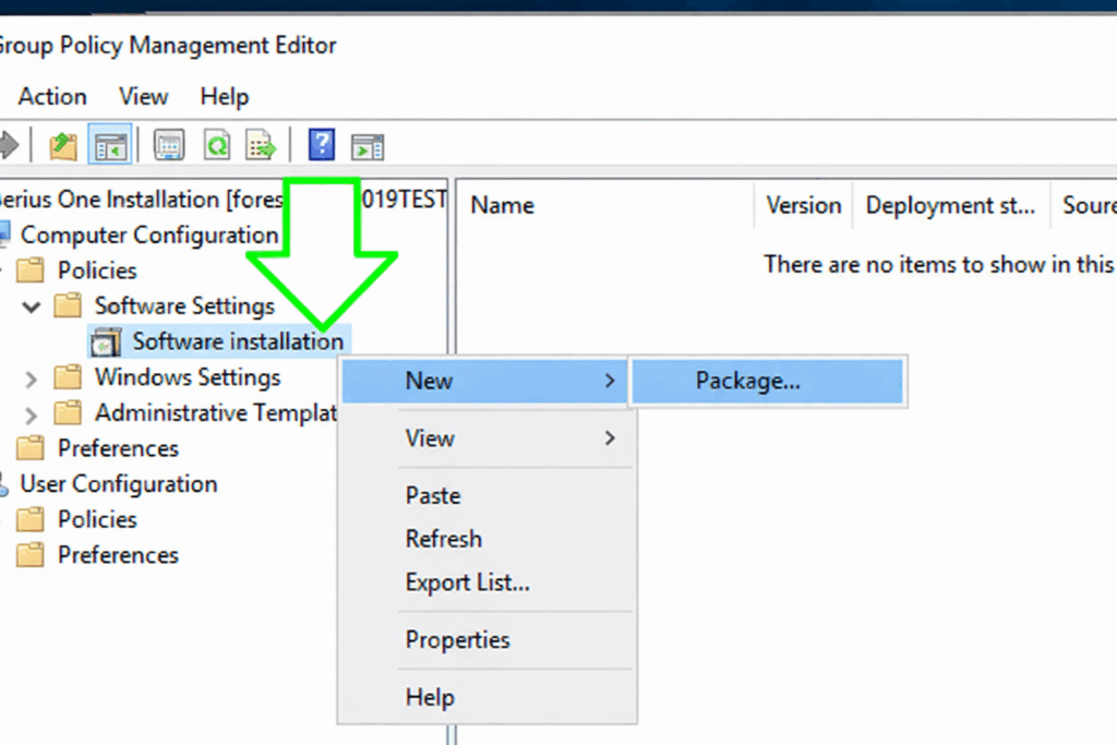 Nella finestra di modifica del criterio di gruppo, andiamo dentro Computer Configuration e quindi clicchiamo sul destro su “Installazione software”, come mostrato nell’immagine e quindi sulle voci di menu per aggiungere un nuovo pacchetto: