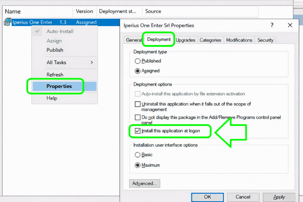 Ora fai click con il pulsante destro sulla riga che è stata creata e vai su “Proprietà. Quindi vai nella scheda “Deployment” e seleziona la voce per installare il software al logon dell’utente.